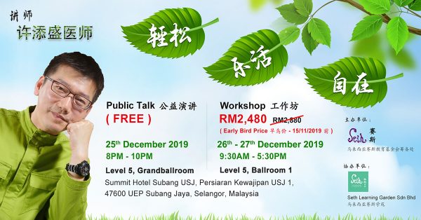 马来西亚赛斯教育基金会 Seth Education Berhad 将会在12月25日晚上8点于 Subang Jaya 的 Summit Hotel 邀请许添盛医师来主持基金会的开幕典礼仪式 , 然后一起来聆听许医师的"轻松,乐活,自在"为主题的大型免费公益演讲。