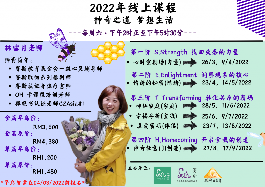 好消息!好消息!??由马来西亚赛斯教育基金会与赛斯学苑及台湾赛斯管理顾问联合主办,由台湾赛斯一级心灵辅导师 – 林雪月老师带领的2022年线上课程神奇之道,梦想生活开始招生啦!???