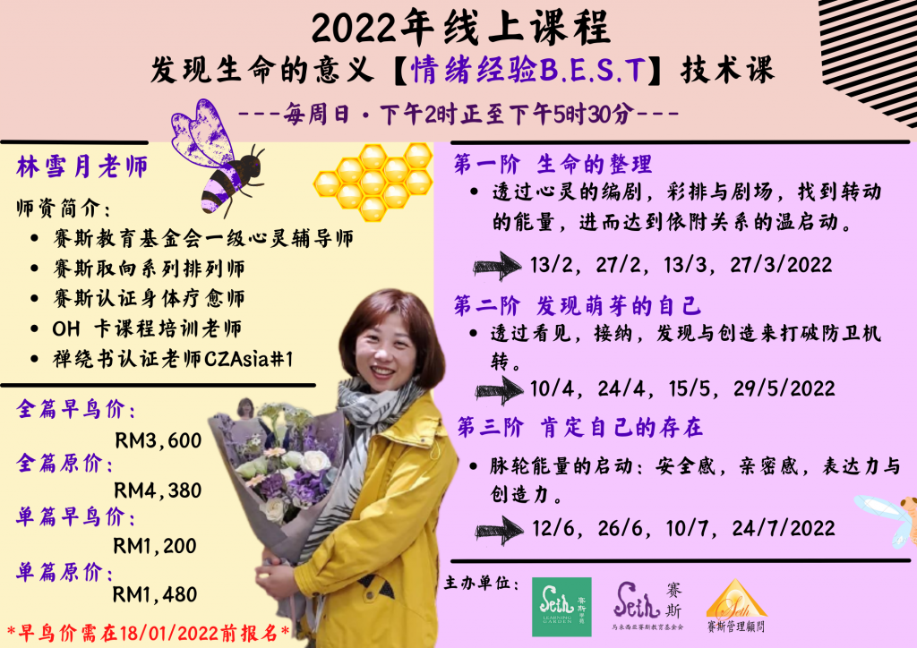 好消息!好消息!??由马来西亚赛斯教育基金会与赛斯学苑及台湾赛斯管理顾问联合主办,由台湾赛斯一级心灵辅导师 – 林雪月老师带领的2022年线上课程 发现生命的意义【情绪经验B.E.S.T】技术课开始招生啦!???
