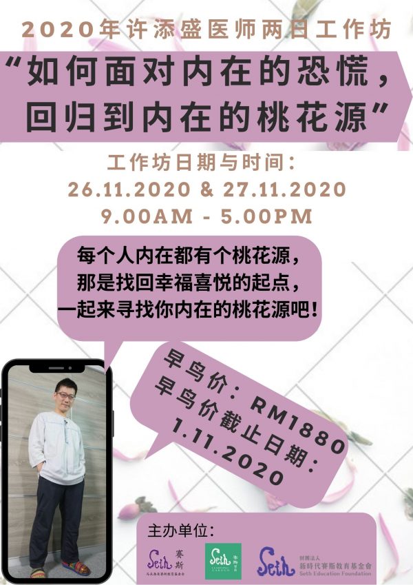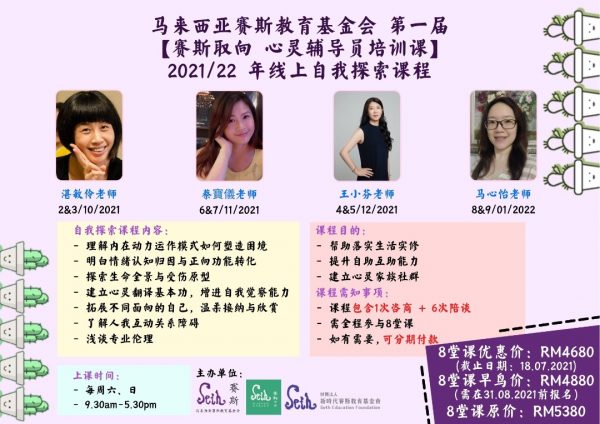 号外!号外!第一届马来西亚赛斯教育基金会"赛斯取向心灵辅导员培训课-2021/22年自我探索线上课程即将在今年10月初开办,欢迎有兴趣学习自我心灵探索的自助者或想成为基金会的助人者(基金会的心灵辅导员)来报名,请大家记得优惠价的截止日期将在18/7/2021结束。 有兴趣报名或获取更多详情,请联络:016-5766552(马来西亚赛斯教育基金会)012-2507384(马来西亚赛斯学苑)
