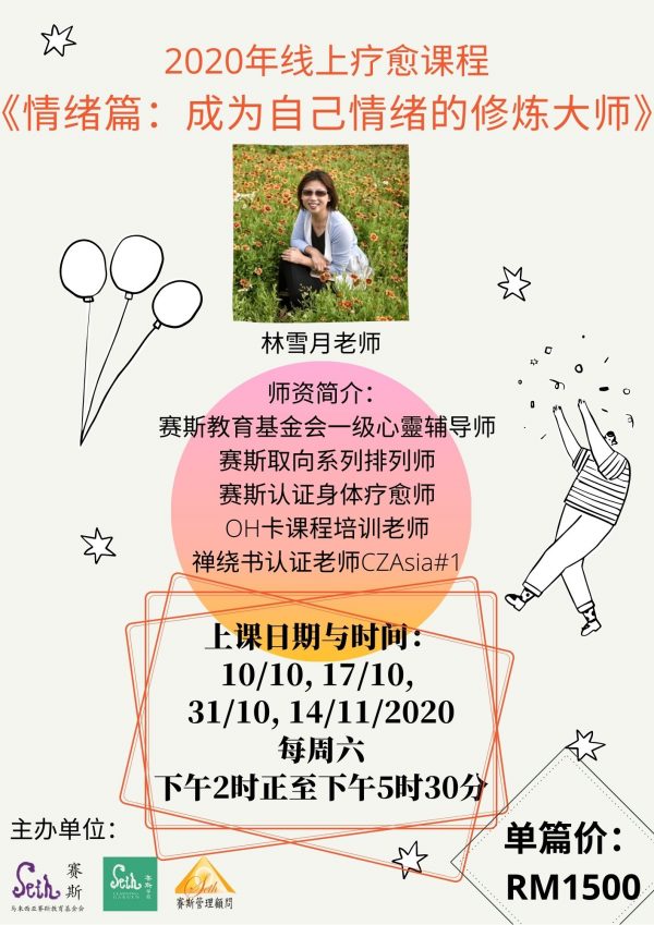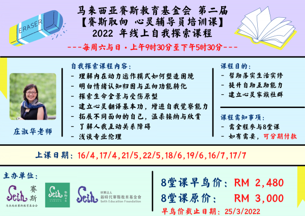 由马来西亚赛斯教育基金会与赛斯学苑,及台湾财团法人新时代赛斯教育基金会联办,由庄淑华老师带领的的第二届【赛斯取向 心灵辅导员培训课】2022年线上自我探索课程开始招生啦!???本课程的目的主要是为了帮助落实生活实修,提升自助互助能力与建立心灵家族社群,凡想达到心灵成长或有兴趣成为助人者都欢迎与我们联络报名!早鸟价售价:RM2,480,8堂课 (需在25/3/2022 前报名)开课日期与时间:2022年4月16日 (星期六),9.30am - 5.30pm欲知更多详情或报名,请联络:016-5766552(马来西亚赛斯教育基金会)012-2507384(马来西亚赛斯学苑)